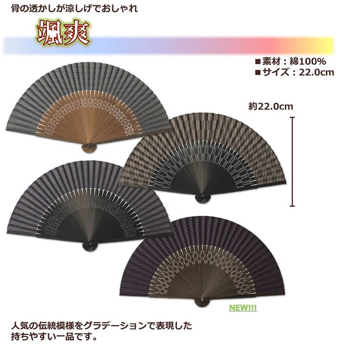骨の透かしが涼しげでおしゃれ ■扇子◆颯爽 吉原つなぎ ・ 青海波 ・ 矢絣 ・ 市松 人気の伝統模様をグラデーションで表現した 持ちやすい一品です。
